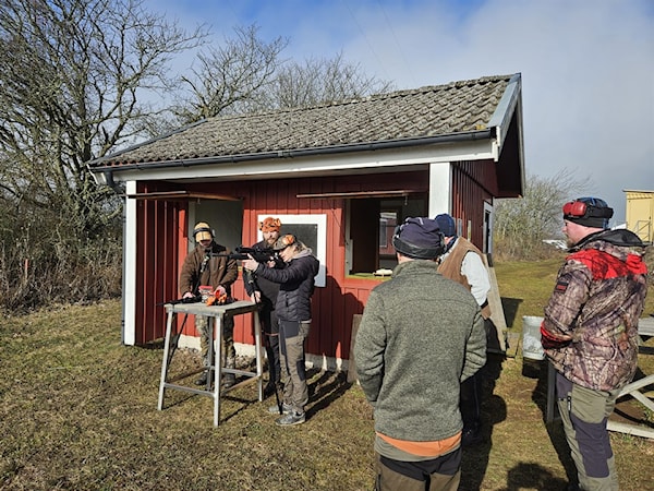 En ganska disig och kall förmiddag ägnades åt att öva på oss själva där vi diskuterade viktiga saker att tänka på . Bland annat fick vi känna på hur obekväm man kan vara som nybörjare genom att skjuta lerduva med vänsterfattning, för vissa gick det bra medan andra helst vill glömma.